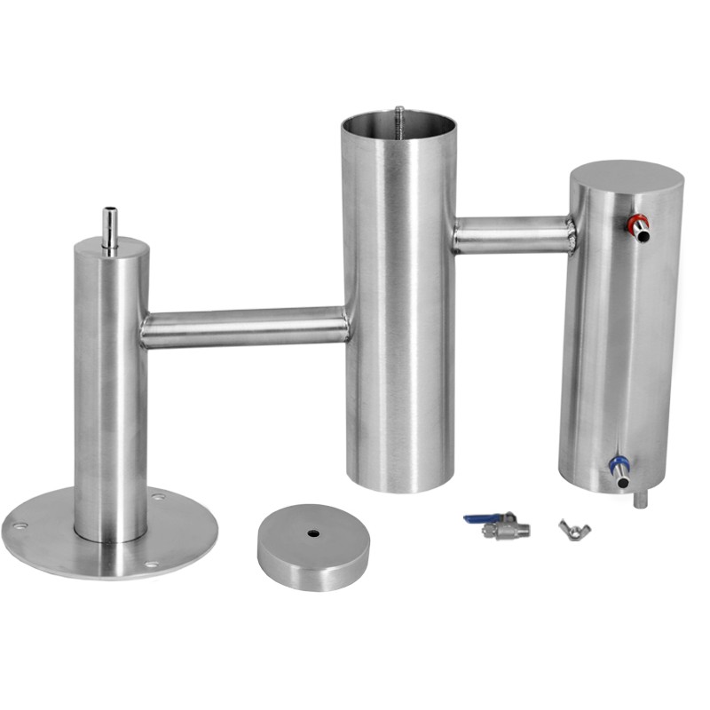 С помощью дистиллятора «ТРОЙКА» Вы гарантированно получите продукт достойного качества. Дистиллятор «ТРОЙКА» представляет собой комплект оборудования домашней винокурни, состоящей из мини-колонны, сухопарника, а также вертикального холодильника, имеющего узел отбора дистиллята и штуцеры подвода и отвода охлаждающей воды. Мини-колонна и сухопарник позволяет повысить степень очистки дистиллята и крепость продукта. В холодильнике пар движется сверху вниз по змеевику диаметром 8 мм и длинной 1200 мм, конденсируется на внутренней поверхности стенок змеевика и стекает по штуцеру, расположенному в нижней части холодильника и силиконовой трубке в емкость. Охлаждающая вода движется во внутренней полости холодильника. Данное исполнение обеспечивает необходимую производительность при небольших габаритных размерах, а также обеспечивает наименьшее гидравлическое сопротивление воды, что позволяет использовать автономное охлаждение и небольшие аквариумные насосы воды. Подвод воды к аппарату и ее отвод осуществляется при помощи ПВХ шлангов. Простота и надежность этой модели делают ее доступной даже для начинающих винокуров. Наличие дополнительных устройств позволяет наращивать функциональность системы.